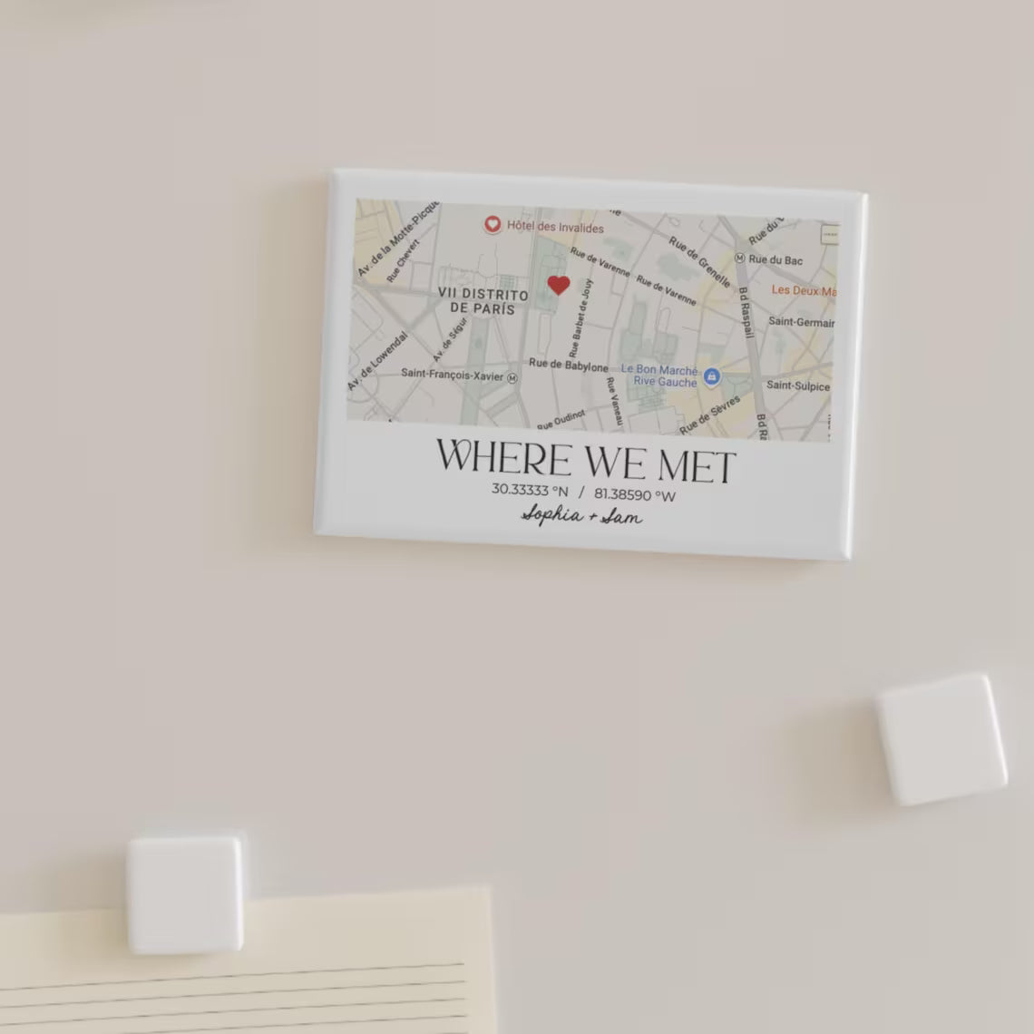 Celebrate special moments with our Personalized “Where We Met” Map Magnets. Perfect for couples, friends, or family, these custom magnets capture the exact location of a meaningful meeting. Each magnet is vibrant, durable, and makes a thoughtful keepsake or gift that brings cherished memories to life every day.